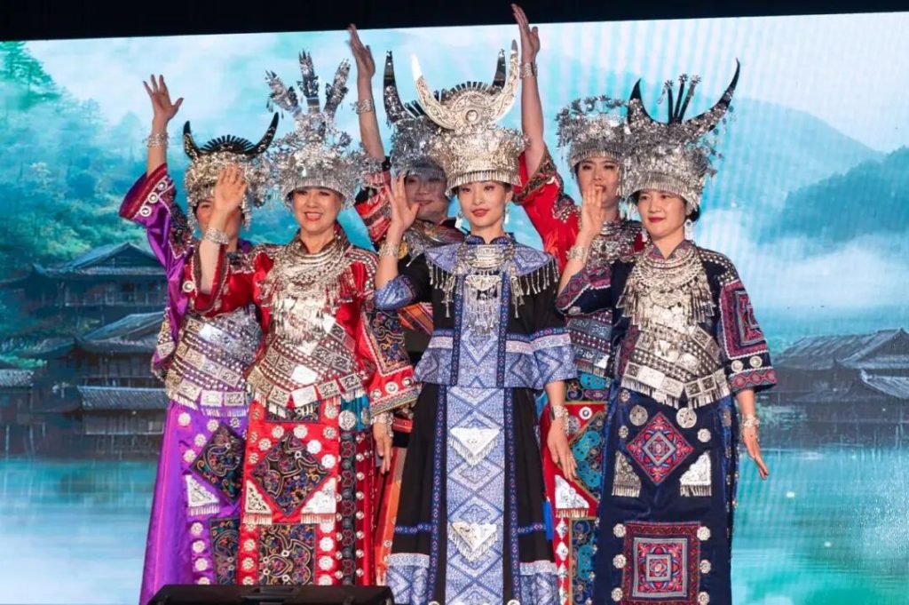 而美东模特队的姑娘们一身少数民族服装表演的《美好家园》,展现的是中华民族多姿多彩的各民族团结盛世。